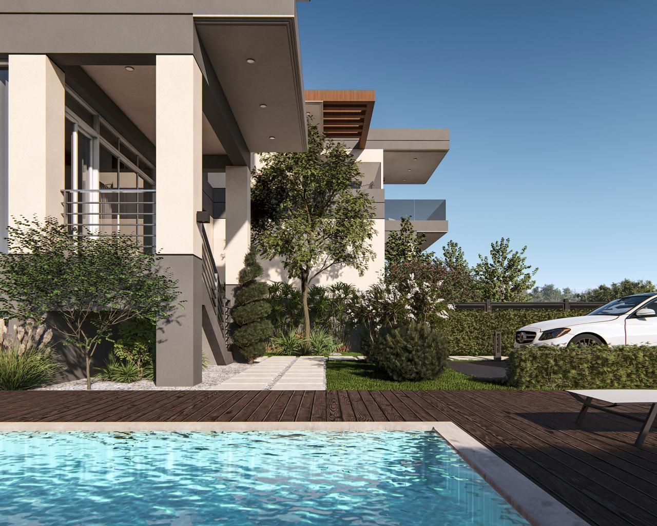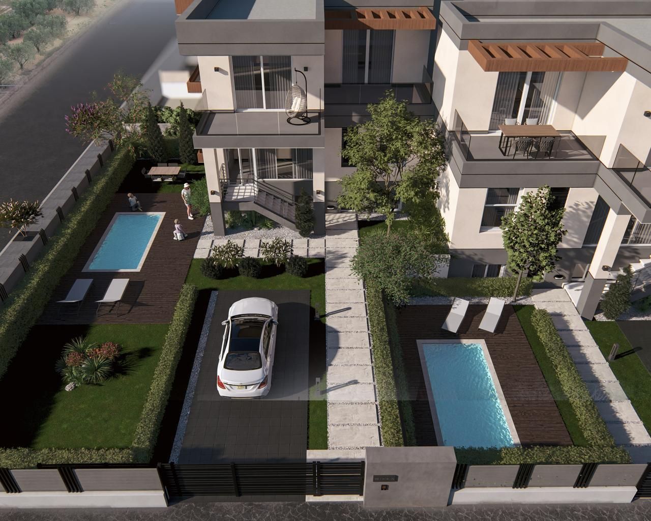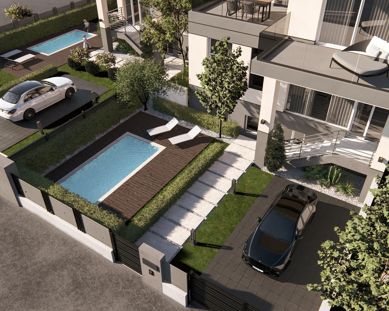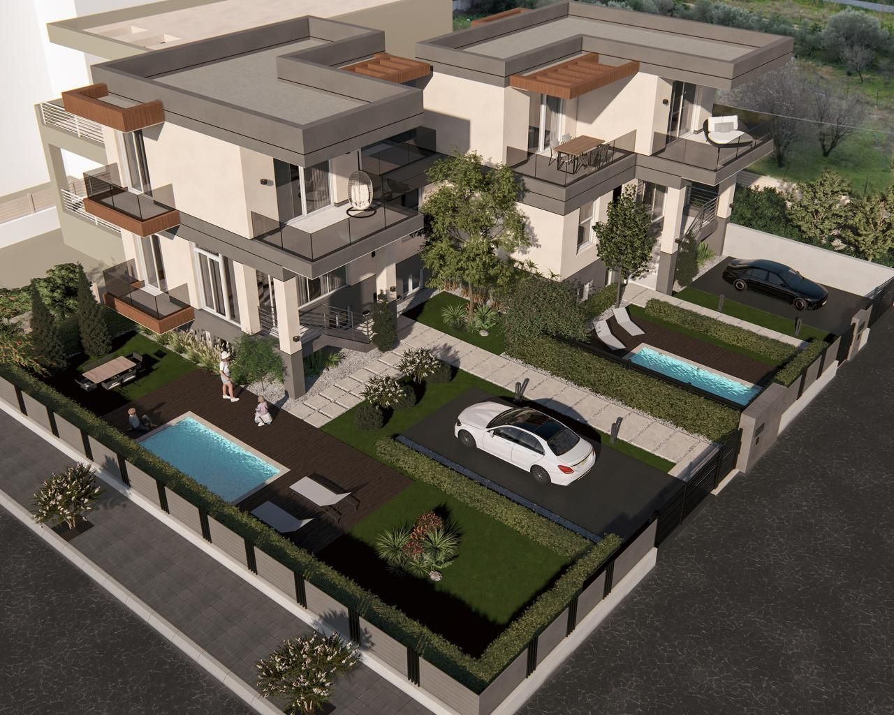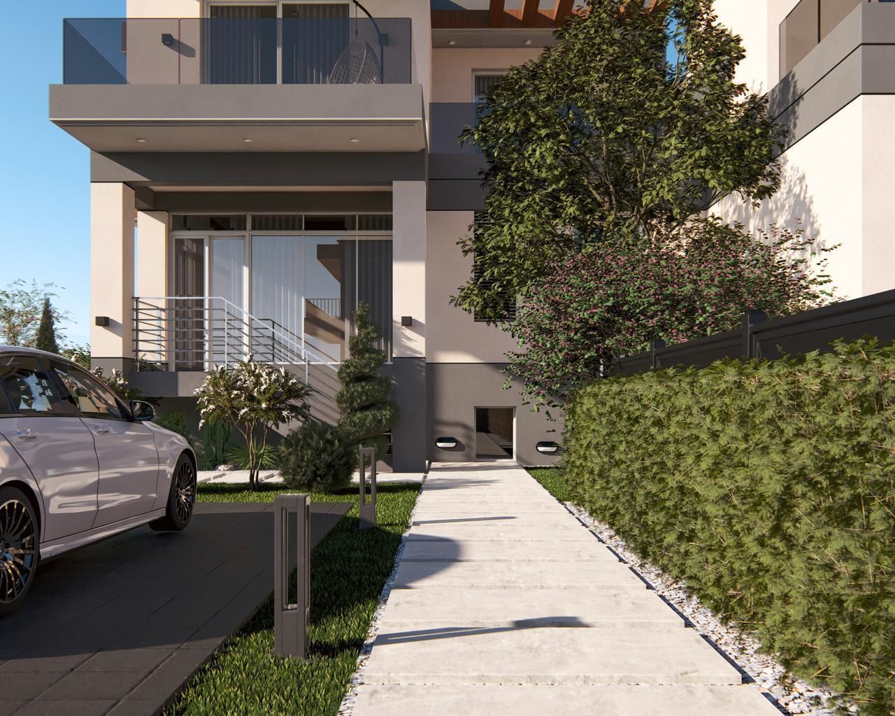 Το κτίριο αποτελείται από τρεις ορόφους συνολικής επιφάνειας 148 τ.μ., με 10 τ.μ. μπαλκόνια και ιδιωτικό κήπο 150 τ.μ. Κάθε κατοικία διαθέτει: