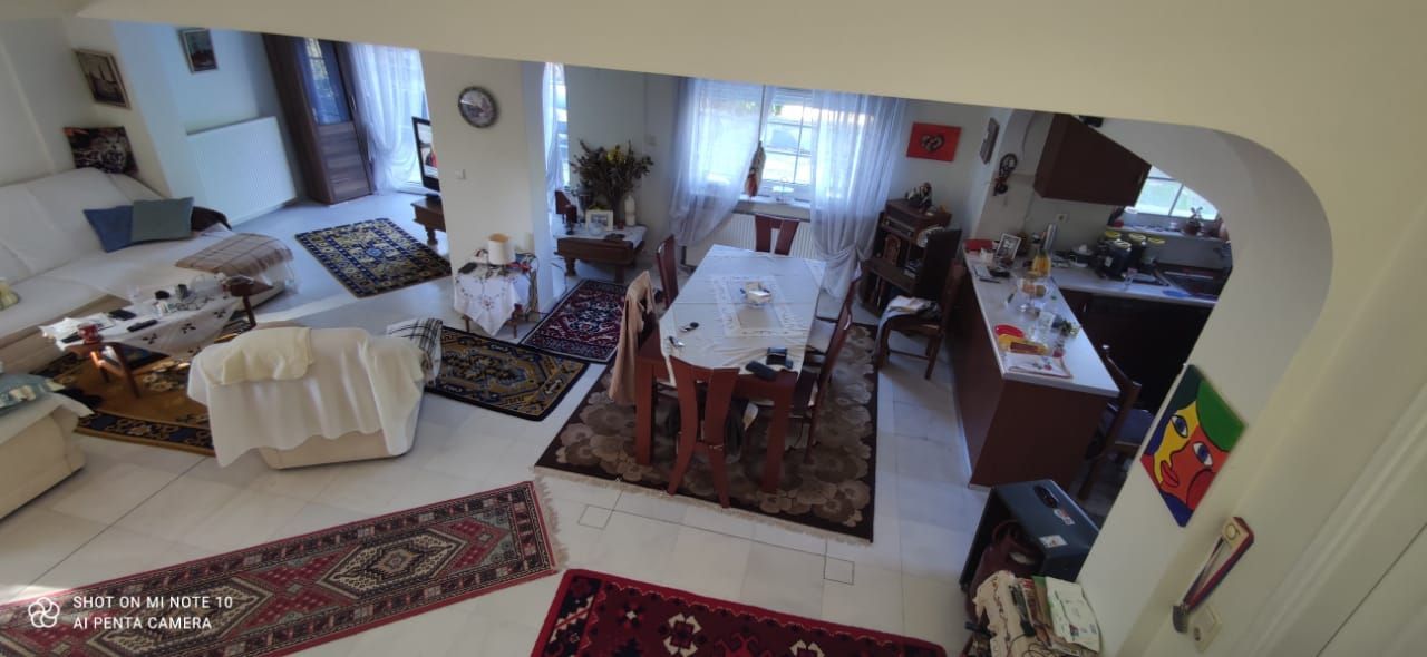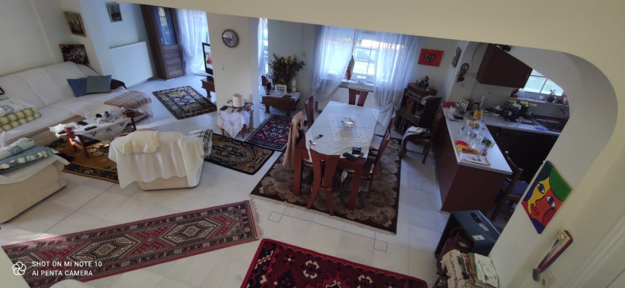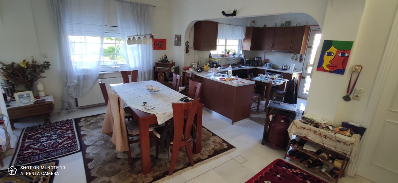 Το ισόγειο φιλοξενεί μια μεγάλη, πλήρως λειτουργική κουζίνα, ιδανική για οικογενειακές στιγμές, καθώς και ένα ευρύχωρο καθιστικό με τζάκι που χαρίζει ζεστασιά και οικειότητα τον χειμώνα. Οι εσωτερικοί χώροι είναι μελετημένοι, προσφέροντας άνεση και πρακτικότητα σε κάθε σημείο του σπιτιού.